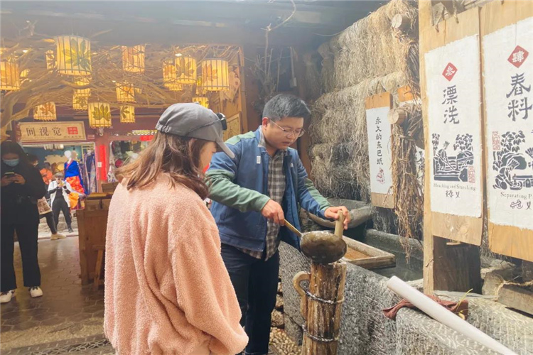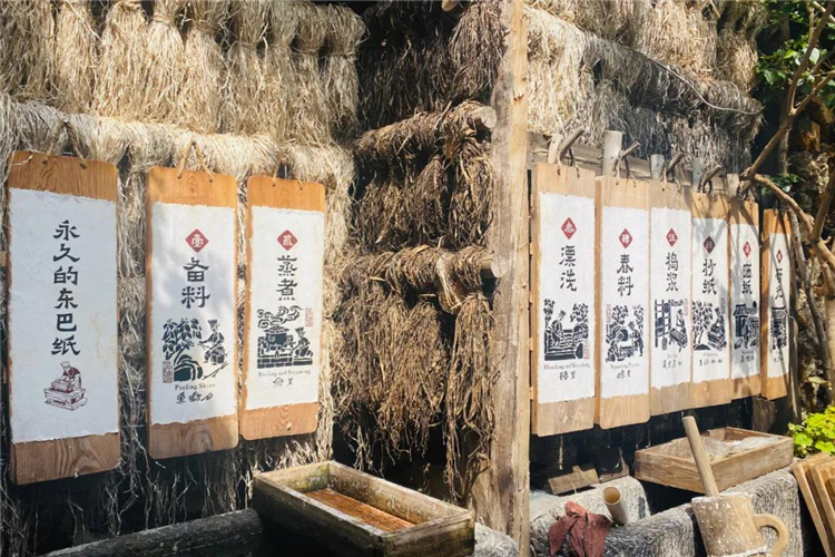 紙坊里,制作紙張的鐵鍋、大小木桶、水槽、木板置放院中,供游人們親手搗漿、搖晃、碾壓、鋪曬,并可以帶走自己親手制作的這張紙,這些充滿趣味的造紙過程是游客們可以在店里免費體驗的。