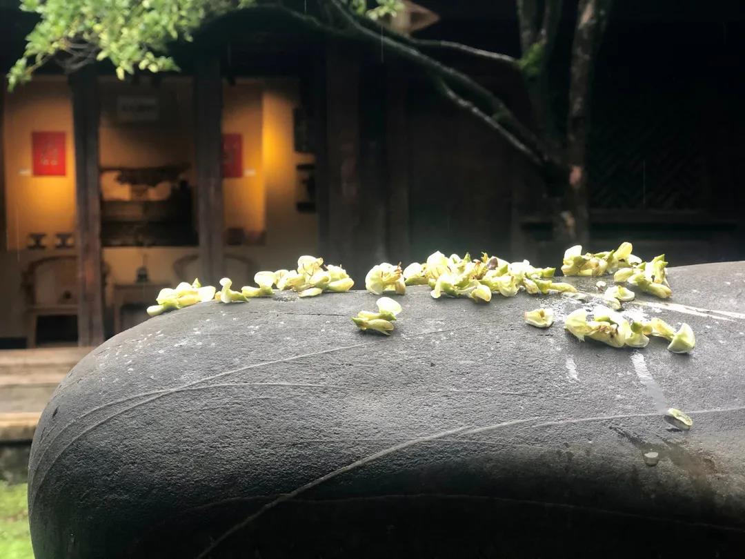 七月,到了雨漸漸多起來的時候,也是恒裕公民居博物館門口的老槐樹花開正好的時候。恐是經歷了一夜的風雨,晨間,老槐樹下的石板路面鋪滿了細碎的槐花,大門的房檐上、瓦楞間、蓄水的水缸里也盡是米黃色小花的身影。