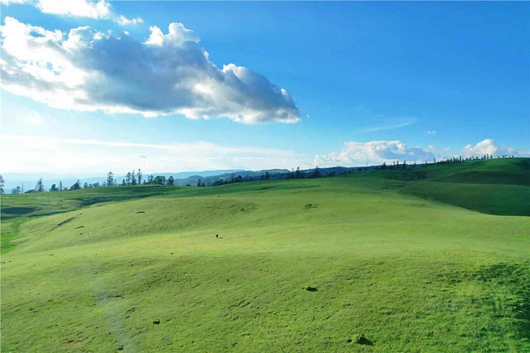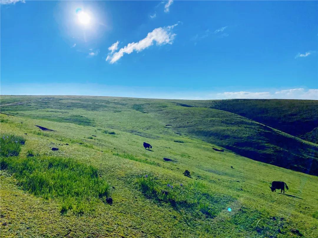 “哞哞哞……”靜謐的草原上偶爾傳來牛的叫聲。一眼望去,牛群零星點綴,或安靜地食著青青嫩草,或興奮地奔騰在廣闊的草地上,從這山越到那山,在屬于它們的樂園里自由嬉戲,盡情享受著大自然的饋贈。