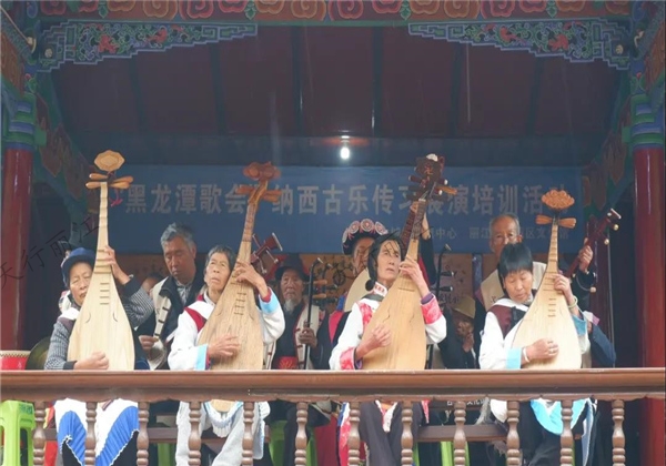 過了五孔橋不久,耳邊便傳來了陣陣古樂聲。朝前細看,古戲臺上十幾位老人正在表演納西古樂。在雨中觀看這樣的表演,不禁多了幾分凄美的意境,別有一番韻味。