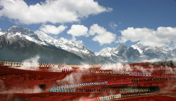 張藝謀導演的以玉龍雪山為背景的大型實景演出,全篇分為“古道馬幫”、“對酒雪山”、“天上人間”、“打跳組歌”、“鼓舞祭天”和“祈福儀式”六個部分,展現了獨屬于麗江的風土人情。沒有舞臺燈光,來自10幾個少數民族的500多個普通的農民只是以雪山為景,用最自然最樸實的演出,最質樸的歌聲,與天地共舞,與自然同聲,很是震撼,值得觀看。