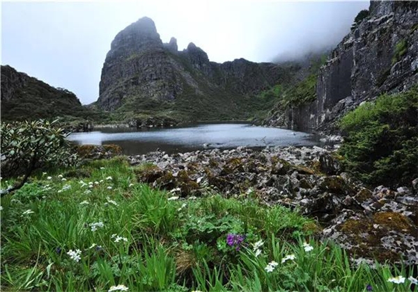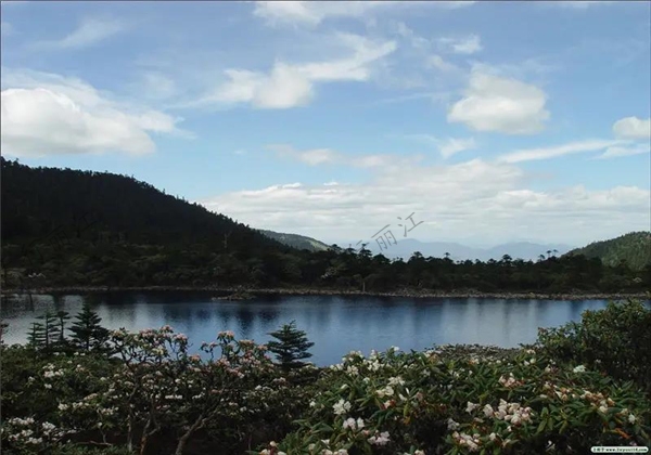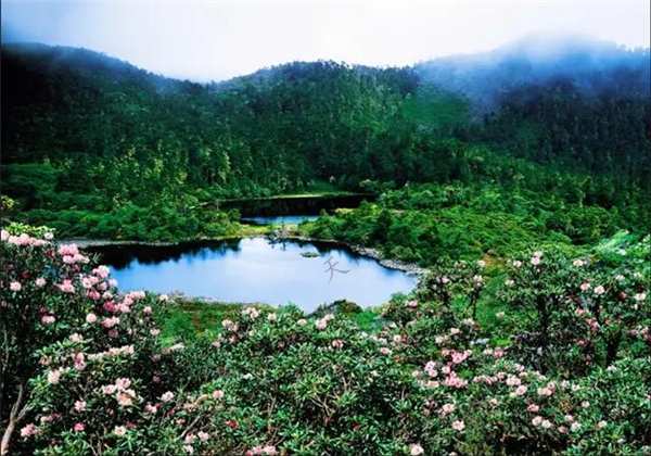 “九十九龍潭”其實并非真有99個龍潭,而是在老君山主脊線北東側海拔3800米以上的山坳里,有數十個湖泊、沼澤,它們沿溪流成串分布,成為老君山一道亮麗的風景線。杜鵑也許不是老君山所獨有的,但這些冰蝕湖卻是少見的。老君山的美,其實除了杜鵑,被杜鵑所包圍著的這些湖泊、溪流更是這片神奇土地的靈秀之所在。它們藏而不露,全部深深地隱于原始密林之中,如非親眼所見,誰也不相信,這高山之巔,這茫茫林海之中,會有星落棋布的龍潭。古林參天,枝桿虬曲的林海中,龍潭無處不在,這兒一泓,那兒一潭,形狀各異,一個連接一個。湖水幽深神秘,在陽光、藍天和花木的映照下呈現出各種絢麗色彩。潭水是春天的融雪和夏季的降雨,清澈冰冷。湖水溢出后,匯成小溪,形成瀑布,集為小河,穿越原始森林,奔向金沙江、瀾滄江!