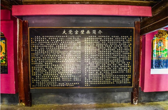 大覺宮壁畫是麗江壁畫的重要組成部分。麗江壁畫于明洪武十八年也就是公元1385年至清代乾隆八年也就是公元1743年之間的300多年間陸續繪制而成,分布在麗江古城內及周圍的覺顯寺、護法堂、萬德宮、珊碧院、皈依堂、光碧樓、寒潭寺、大覺宮、大寶積宮、琉璃殿、大定閣、福國寺、雪松寺等十幾處,約在200鋪以上。現僅存白沙大寶積宮、琉璃殿、大定閣和束河大覺宮等處。共計50鋪,總面積154.57平方米。在歷史上稱為蠻荒之地的祖國西南邊陲保存了如此大規模的壁畫,堪稱奇跡。