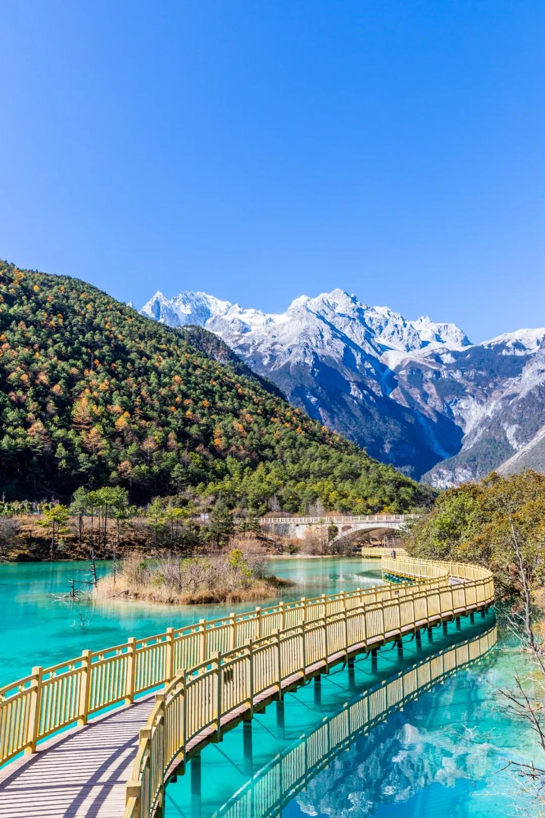 山中湖泊眾多,以最大的藍月谷為首。藍月谷一年四季澄清碧藍,不一樣的季節變幻出不一樣的美。而離雪山最近的雪花湖,便是拍攝群山倒影最好的地方。