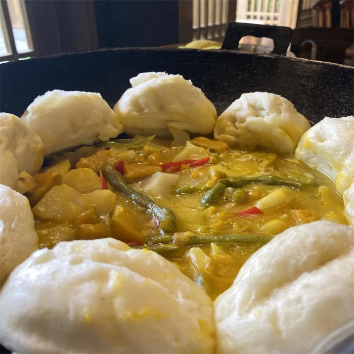 一口不大的鐵鍋,里面煮著農家南瓜和洋芋,這就是“納西咖喱”,軟糯的南瓜,入口即化的洋芋在柴火的慢煮下湯汁變得濃稠,看起來充滿食欲。鐵鍋的邊上則貼著一個個花卷,花卷的底部在鐵鍋溫度的烘烤下變得焦脆,盛一碗南瓜洋芋,把花卷掰成小塊泡在湯汁中,美滋滋。