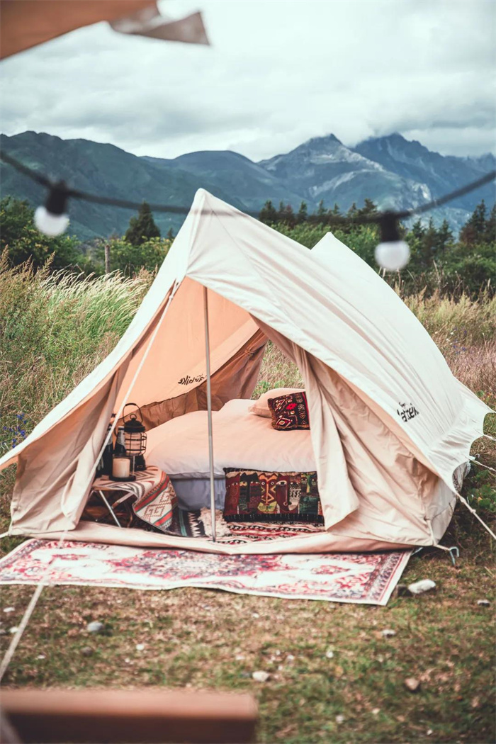 很快就到達(dá)了營地,可以說是到達(dá)了夢想中的生活。在群山中藏著的一片空地,周圍一圈圈狗尾草,幾頂帳篷放置其間。在草地上鋪一塊毯子,往上一坐就是舒適愜意的田園隱居生活。