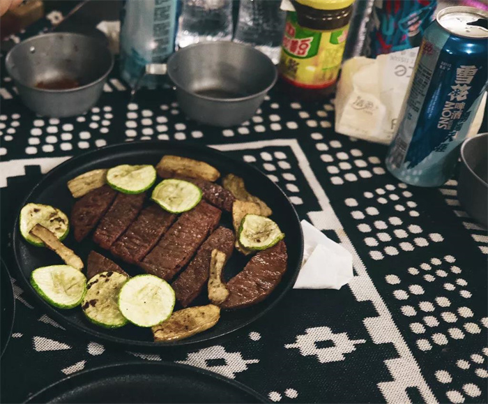 伙伴們展示自己手藝的時(shí)候也到了。隨著鍋碗瓢盆“哐啷”交錯的聲響,營地中開始彌漫著食材的香味。在營地中晚餐時(shí),太陽日落西斜,一點(diǎn)點(diǎn)消失在夜空中,營地亮起了星星點(diǎn)點(diǎn)的燈光。