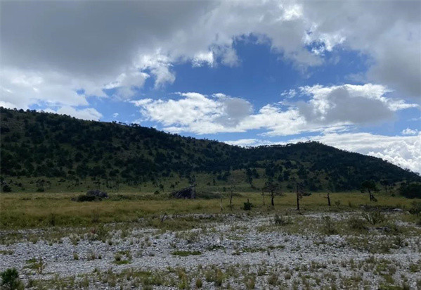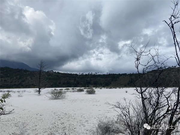 嗯,是干河壩了,雪山冰川沖擊成的河谷,由于前一晚下過雨,這些白白的碳酸鈣成分的東西其實腳踩很可能陷進去,莫名有一種沼澤的感覺,我的鞋子就在這里整個踏進去了,陷進去大概20厘米,好不容易才脫身。在這里,就是小紅書里關于干河壩95%的取景地了,加上個濾鏡,很仙很寂靜。跟著軌跡是在干河壩右邊爬坡離開,一個小爬坡,到山頂可以俯瞰遠方。但是后面的下坡就比較艱難了,畢竟積聚了4,5小時的疲憊。但是路是不難走的,我們好像1小時不到就走到了馬路,過了馬路,就是前文提到的甲子頂峰餐廳,在走之前,我擔心打不到車,叫了順風車,結果滴滴上是有合適的路線,但是沒人接單,不我在問了下旅行社的車,問有沒多空位拼車回麗江,他讓我們直接打車,嚯,還以為不能打。結果50元出頭,就直接送我們回了古城。至此徒步結束。關于出行。這次只帶了點路上吃的干糧,當天不曬(甚至是陰天,所以玉龍雪山基本沒蹤影),所以沒喝很多水,但是防曬還是不能省的,不建議穿短褲,10月份去的話,帶件薄外套就夠了,沒有專業裝備。這條線路目前還是很小眾的,即使在國慶,人都不多,在干河壩處,我們只見到兩伙游客,其他的都是本地人,但不知道為什么他們要走進山里,這個地方小眾到有些本地人都不知道,就知道璞修和石洛克這兩個酒店在開發這條線作為一個旅行體驗。另外就是我前文提到的ota上這條線360元,往返的車+領隊+零食,感覺自己賺大發了。順帶,查資料時還種草了一個叫螞蟥壩的地方,也是在玉湖村附近,看圖片也蠻好看的,下次再出發~