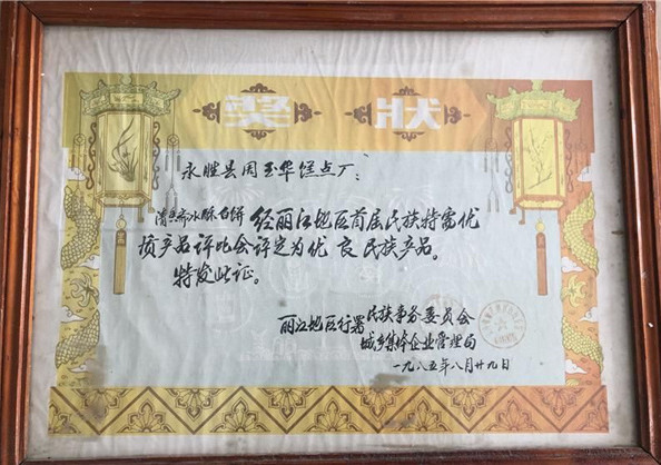 在30余年的傳承經(jīng)營中,周玉華不斷創(chuàng)新,增添品種、擴(kuò)大經(jīng)營、改進(jìn)包裝。目前,“清香齋”已有2家分店,學(xué)徒10余人,“清香齋”的產(chǎn)品也遠(yuǎn)銷北京、成都、昆明等地。據(jù)了解,早在1985年,“清香齋”就曾榮獲麗江行署頒發(fā)的“優(yōu)良民族特需優(yōu)良民族產(chǎn)品獎(jiǎng)”;2015年,“清香齋”榮獲“最佳名特小吃獎(jiǎng)”;近日,“清香齋”新產(chǎn)品松茸云腿餡水酥餅又獲得“云南省金牌月餅獎(jiǎng)”;2017年6月,永勝縣水酥餅制作技藝被列入云南省第四批省級非物質(zhì)文化遺產(chǎn)代表性項(xiàng)目,水酥餅由此憑借著獨(dú)特的口味和制作工藝,遠(yuǎn)銷國內(nèi)外。