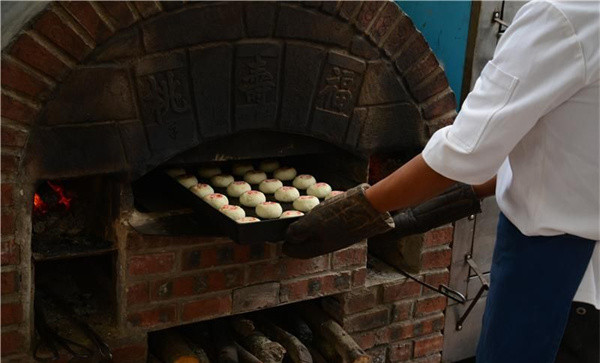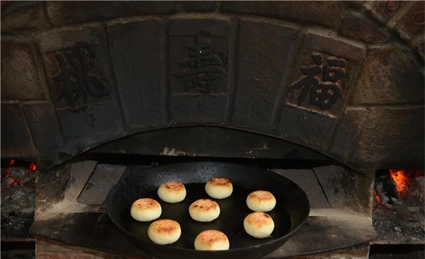 5、烤制:傳統(tǒng)的碳火烤制。將浸泡好的圓餅取出后放入烤盤,然后再放入專用的爐中,下面用捂好的碳火作底火,上面用碳火,烤制20分鐘左右即可食用
