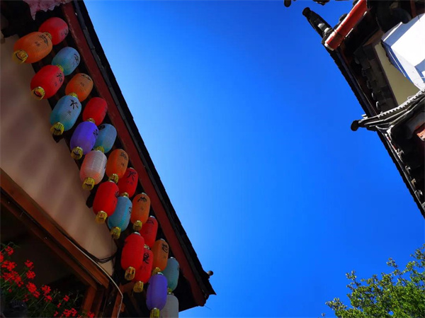主街傍河、小巷臨渠,水是麗江古城的魂,四通八達(dá)的自然水系讓古城充滿了靈氣。清澈見底是常態(tài),偶爾能遇到兩條逆流而上的魚,偶爾也會(huì)遇到水中自由招展的水草。漫步在石板路上,在潺潺的流水聲中,滿身的疲憊和倦意仿佛都被帶向了遠(yuǎn)方。冬日天生自帶一股靜謐感,流水之聲便越發(fā)清澈靈動(dòng)起來。如果聽過一滴水經(jīng)過麗江的故事,那此刻,你一定在古城的流水里感受到了來自雪山的氣息,清冽中帶著勃勃生氣,奔騰著去往了春天的方向。如果你在這個(gè)冬天來,借你一片最澄澈瓦藍(lán)的天空吧,讓你在平凡的日子里再怦然心動(dòng)一回。也許,麗江的藍(lán)天白云早已經(jīng)不是什么秘密了,可當(dāng)你踏足的那一刻,相信還是會(huì)嚇一跳,因?yàn)槎盏柠惤懦牵炜盏乃{(lán)又加深了一個(gè)度。