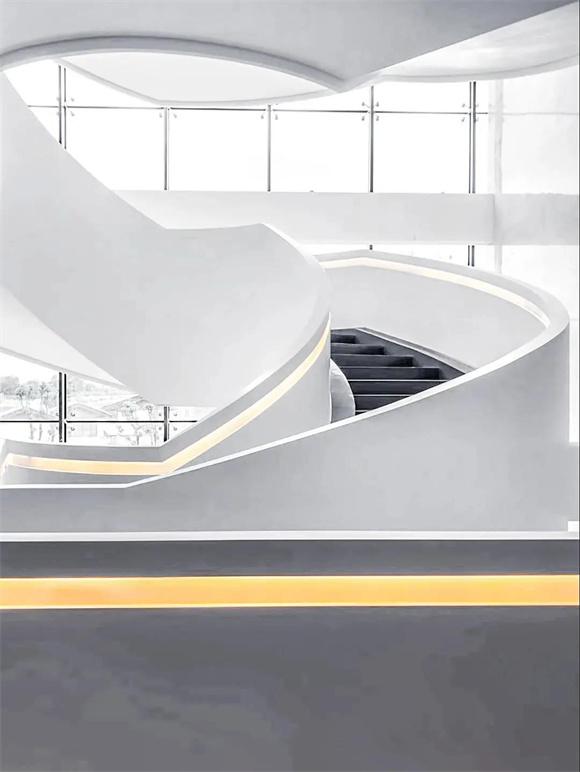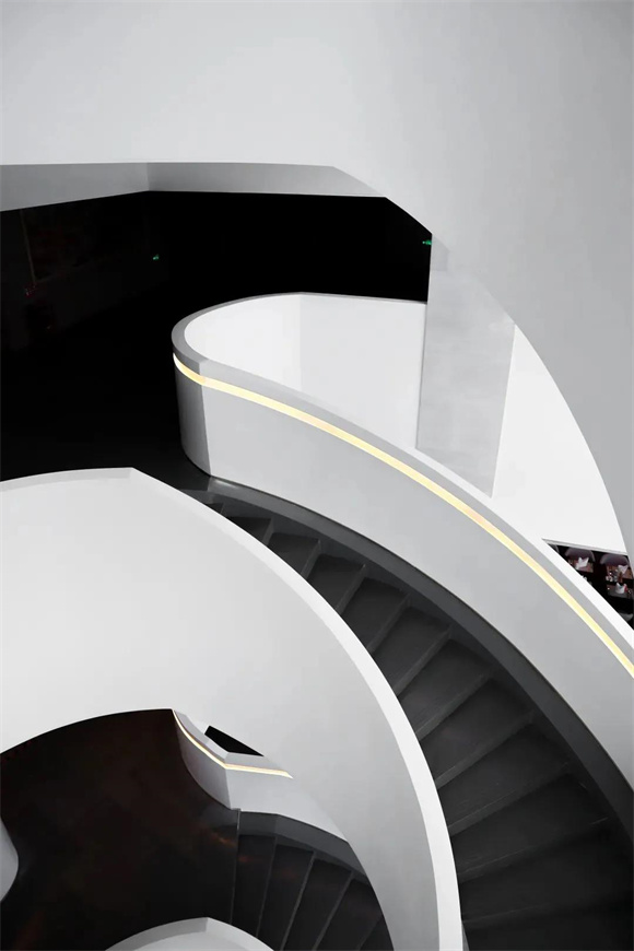 酒店內部尤為吸睛的當屬旋轉樓梯,純白的外衣散發著云貝般的光澤,溫暖的燈帶順著樓梯延展,優雅而頗具未來感。由下仰望,如云朵慢慢升騰;自上俯瞰,又如花朵悄然綻放,隨手一拍都是INS風爆棚的美照,儼然已成為酒店的網紅打卡點。