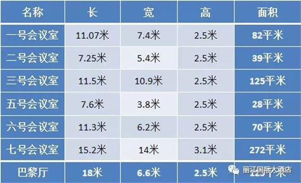 酒店擁有7個會議室,其中的多功能廳,面積272平米,可同時容納180人的會議或200人的宴會。兩個125平米的會議室,可容納90人會議或宴會用餐;三個董事會專用會議室及一個接見型會議室,可容納10--30人會議