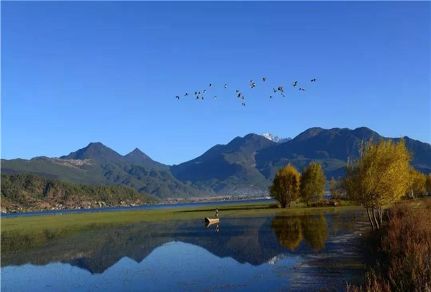 漫步拉市海濕地公園,藍天白云下,濕地里的小花和綠草在習習微風中搖蕩,一梭魚船穿過花叢,水波輕輕地拍打水草,聲如天籟。