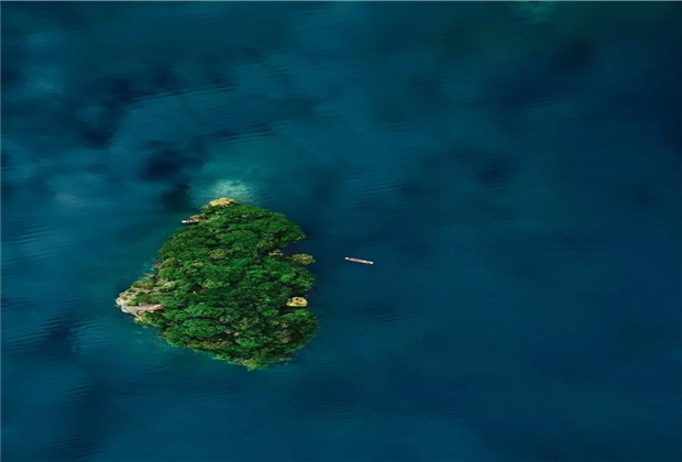 湖中坐擁數座小島,島上風光旖旎,四面環水,海天一色,湖水廣闊無垠,岸邊群山環繞,蒼郁蔥蘢。