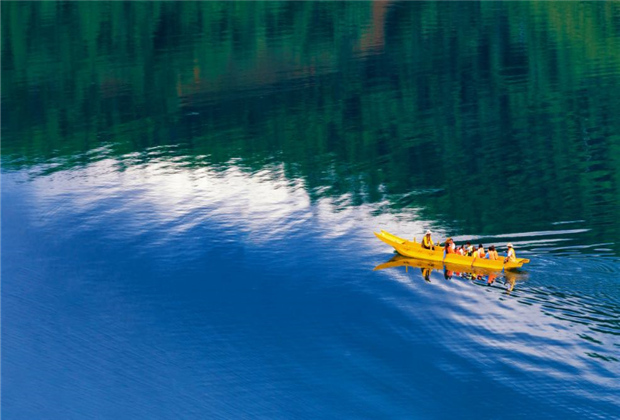 湖水波瀾不驚,光滑如鏡,遠看是一片深藍幽光,近看可見清澈水底的水草,青山白云的倒影與湖水融為一體,這就是萬物叢生的感覺吧。