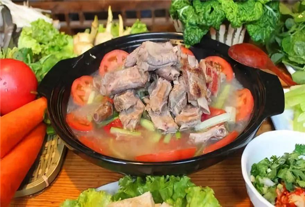 臘排骨熬煮入味,湯汁濃郁噴香,配上新鮮的蔬菜,特制的蘸水,吃起來(lái)鮮美不膩。