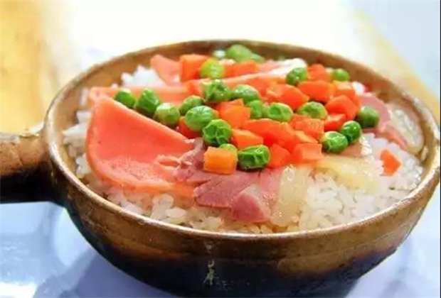 土豆和豌豆是砂鍋飯的標(biāo)配,但一份好的砂鍋飯一定要搭配上好的火腿肉。這里的火腿呈紅色,收湯的過(guò)程中火腿的香氣收到了米飯里,米飯香氣撲鼻的同時(shí)火腿也變得咸淡適中。
