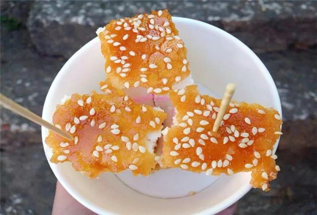 軟糯的米糕上裹著甜膩的焦糖,相得益彰,焦糖混合著米香不再那么甜膩,香米混合著焦糖不再無(wú)味。一口下去唇齒間留香,很有嚼勁。