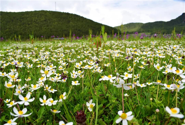 五顏六色的小花整片整片地開(kāi)放在這片高山草甸上,就像一塊美麗的五彩織錦,花開(kāi)傾城。