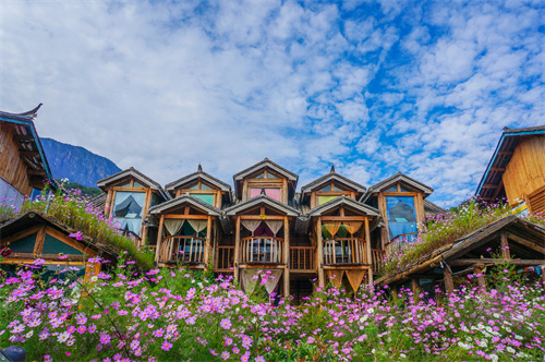 偶遇幾位在家門前休息 和背著籮筐出門勞動的納西村民 他們的服飾還保留著納西民族特色 臉上也寫滿了高原日曬和辛勤勞動 所留下的歲月之痕DASHU 院子邊的花草恣意而開 燦爛無比,又嬌媚柔美 和粗獷的石頭形成鮮明的對比