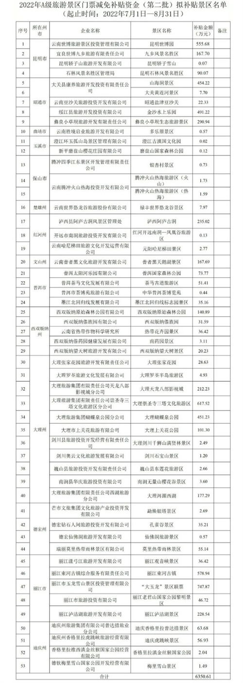 擬獲第二批補貼的53家景區來自昆明、大理、麗江、西雙版納等14個州市,從單家景區來看,“大玉龍”景區聯票擬獲補貼金額最高,達到747.87萬元,麗江束河古鎮排名第三位,擬獲補貼578.94萬元。