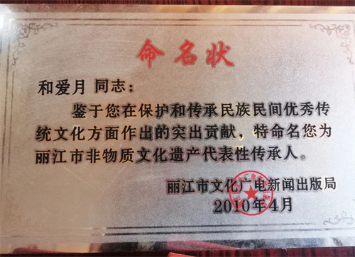 2010年4月,和愛月被命名為麗江市非物質文化遺產代表性傳承人。