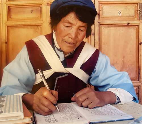2003年,53歲的和愛月開始學習納西拼音文,到2022年共19個年頭里,和愛月帶著孫女共參加了30多期“納西拼音文培訓班”,從一個納西拼音文的學生,逐步成為了一位受人尊敬的納西拼音文創作者。