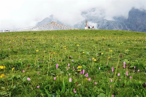 在玉龍雪山深處的云天里、雪峰下,有一片海拔3600米的高山牧場叫牦牛坪。每年夏天,這里山花爛漫,秀若織錦。秀美的草甸背后是壯美的玉龍雪峰,起起伏伏的草甸上,遍地盛開著五彩繽紛的高山花卉。
