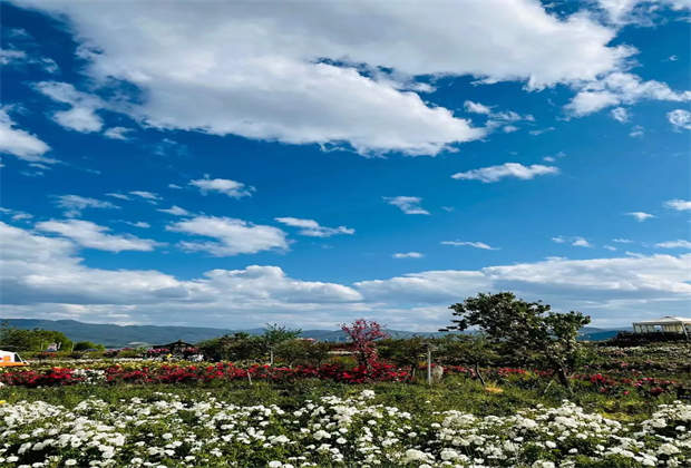 在20萬平米的聽花谷中,整冬整春的開,盛夏里也要開,3千棵向日葵,五萬束薰衣草、8萬株繡球、9萬萬朵玫瑰和一格一格的馬鞭草、郁金香、格桑花花海斑斕,綠樹成蔭,羊駝顧盼,站在谷里就能聞見雪山的風和花的幽郁,香氣格外濃烈,香了聽花谷也要香出聽花谷