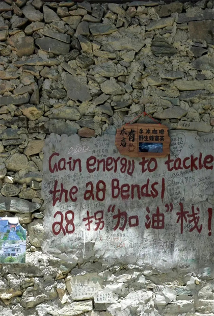 28道拐,需要你連續(xù)攀爬,很是耗費(fèi)體力,沿途的玉龍雪山會一路召喚你前行。居高臨下俯瞰上虎跳峽——看到一塊寫著“山頂”字樣的石頭