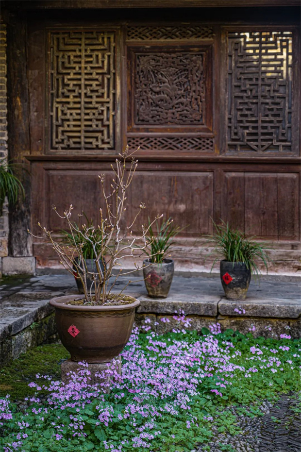 開門,笑吟吟開始新的一天。偶有納西老人背著背簍走過(guò),簍里裝滿了山間野菜,那是春天獨(dú)有的味道。