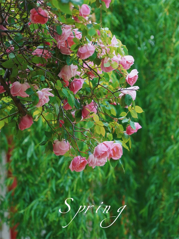 攀援的藤蔓依偎著古柳,粉色的花瓣與新生的柳條相映成趣,糅合成一幅流動的畫卷。