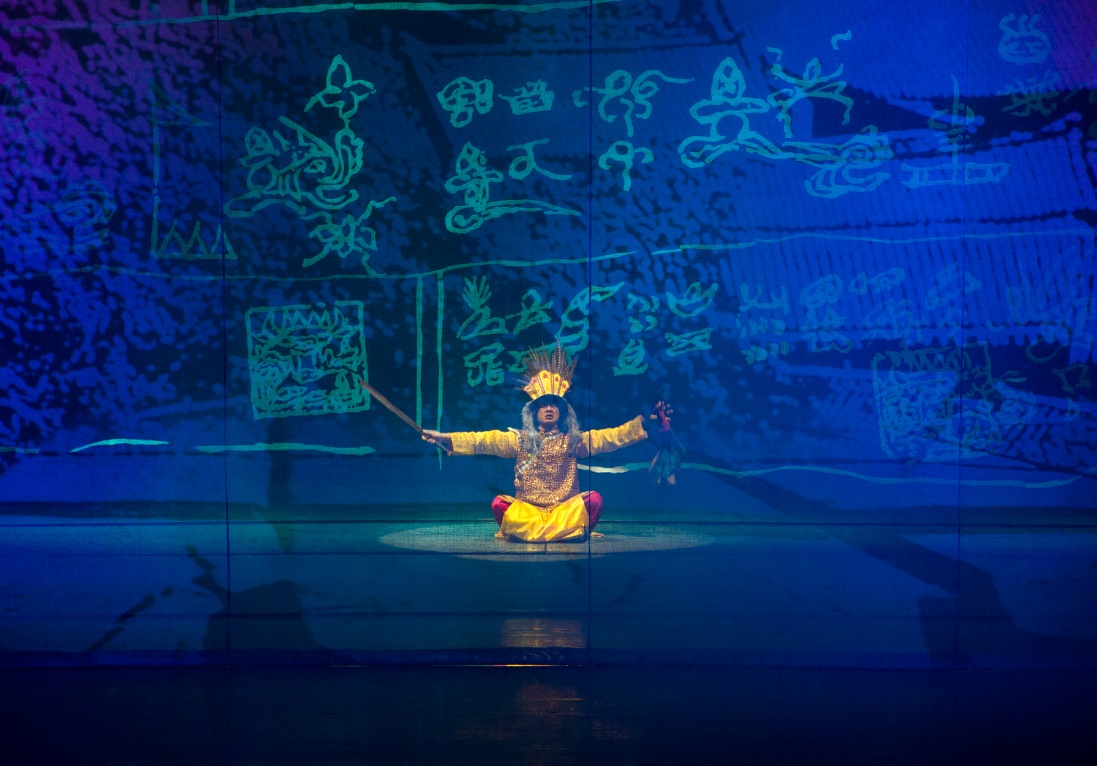 墨藍色的背景若隱若現,神圣的東巴一襲金色長褂在帷幔間搖起手中的銅鈴,背后飄過青色的東巴文字。再一瞬間,激昂的音樂伴隨著雪山女神從天而降,勤勞熱情的納西姑娘們舞步鏗鏘,踏歌而來。此情此景將人們置身在一幅古老久遠的歷史畫卷中。在這里你可以看到世界上僅存的象形文字——東巴文字;可以看到東巴教祭司以他獨特的方式向你講述著厚重的歷史;而威嚴慈愛的雪山女神則以她特有的方式呵護著陽光如風的滇西北高原,呵護著自強不息的高原民族。