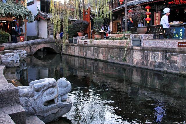 麗江古城是一座沒(méi)有城墻的古城,古城倚玉龍雪山雪水、黑龍?zhí)朵迦ǎ郎桨鴦?shì),環(huán)繞古城的三大水系從玉龍橋穿街過(guò)巷,入院穿墻,流布全城,形成“家家流水戶(hù)戶(hù)垂楊”的江南景色,既有山城之容,又有水城之貌。