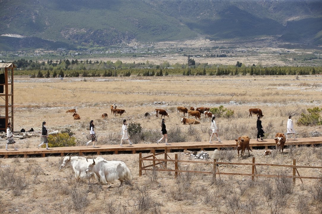 發布會秀場真實還原了當地游牧族群的生活實景,以雪山為背景,取自然之大成,木堆、瞭望塔、草垛、柵欄、牛羊等元素裝飾凌空而起,將靈性自然的意境躍然眼前,以最直觀的方式將原生態韻味展現給現場觀秀嘉賓。