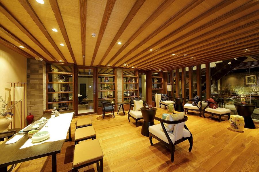 ●穿過花叢,順著那道精致的水墻,繞過水路,進入了酒店大門。全木質結構的背景墻,古香古色的大廳,既落落大方又富有創意,瞬間讓人眼前一亮。進門右手邊是前臺,前臺人員均穿著納西服裝,將納西文化生動的表現出來。進門正前方就是休息室和茶室,在等待辦理入住手續的過程中,茶藝師為我們沏了一壺上等的云南普洱茶。