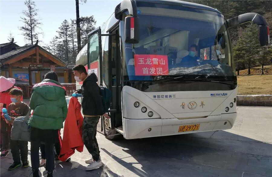 玉龍雪山銀裝素裹、麗江大地鮮花盛開。3月22日上午,麗江市多家旅行社在暫停經(jīng)營旅游團(tuán)隊業(yè)務(wù)59天后迎來首發(fā)團(tuán)。“掃碼了嗎?身份證帶了嗎?座位上貼有請勿入座標(biāo)志的,大家不要坐。”四輛大巴車前,游客有序地排著隊,導(dǎo)游和旅行社工作人員在挨個為游客測量體溫進(jìn)行登記時,口中一遍遍重復(fù)著注意事項。在進(jìn)行了簡短的首發(fā)儀式后,85名游客通過掃碼、測溫,分別登上了前往玉龍雪山、瀘沽湖和老君山的旅游大巴。