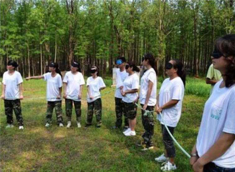 盲人方陣,也叫黑夜協作,這是一個以團隊挑戰為主的項目。用教練給的繩索圍成一個面積最大的正方形,看似簡單吧。但是當所有的人被蒙上眼睛的時候,隊員會發現,原來難度一點也不小,并且大家將體會到團隊的指揮、溝通、協調能力還真不能被忽視。一群盲人在黑暗中摸索,他們必須集體完成一個十分精細的任務。在茫然無助的探索中,管理中的現象在此都表露無遺,很值得學員去體味和思考。