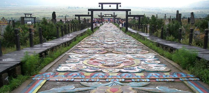 東巴萬神園是以弘揚和展現(xiàn)納西族古老神奇的東巴文化,再現(xiàn)人與自然和諧發(fā)展為主題的人文、自然旅游景點。園內主要展示了東巴教藝術中的輝煌巨著——“神路圖”,充分表現(xiàn)了納西族哲學觀念中的“神界”,“人間”,“鬼域”所構成的世界。“神路圖”被譽為“環(huán)球宗教第一繪畫”,它長240米,寬6米,在園內直指扇子陡主峰,氣勢恢宏壯觀。整個園內還聳立著近千樽神情莊嚴自在,選形怪異奇特的納西木雕神祗、精靈以及木牌畫,圖騰柱等。其神靈形貌往往是人與自然界各種動物的結合體,生動形象地表現(xiàn)了人類文明童年時期詭怪陸離的精神世界,和對大自然深遂的觀察力和思索,并由此迸發(fā)的神奇想象力震撼心靈,給予人們奇妙的力與美的享受。