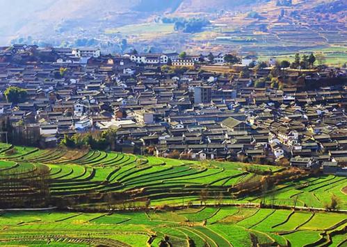 作為“魚米之鄉”,春季的永勝一派怡然的田園風貌。山林之間,梯田成片,瓦房周圍,一汪碧湖,完全就是理想中世外桃源的既視感。